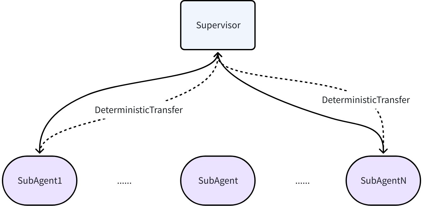 在 Supervisor 模式中,子 Agent 执行完毕后固定回到 Supervisor,由 Supervisor 生成下一步任务目标。此时可以使用 AgentWithDeterministicTransferTo: