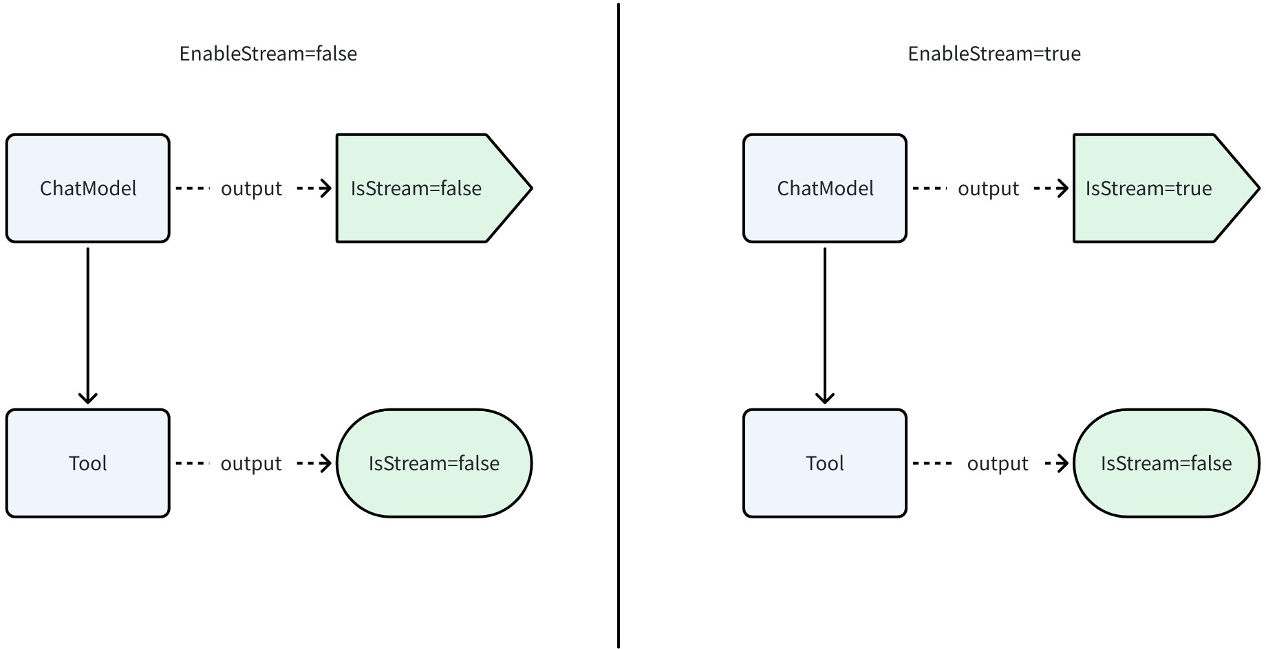 EnableStream=true时,ChatModel 输出流,Tool 因为不具备输出流的能力,仍然输出非流。